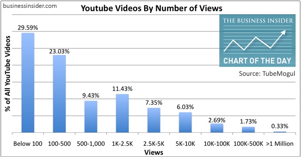 Most successful YouTube partners usually rely on one “star video” for a bulk of their earnings. The stats are hard to come by but, judging by observation and some 4 year-old figures, I’d estimate that the average YouTube video only gets about 1000 views in its lifetime.